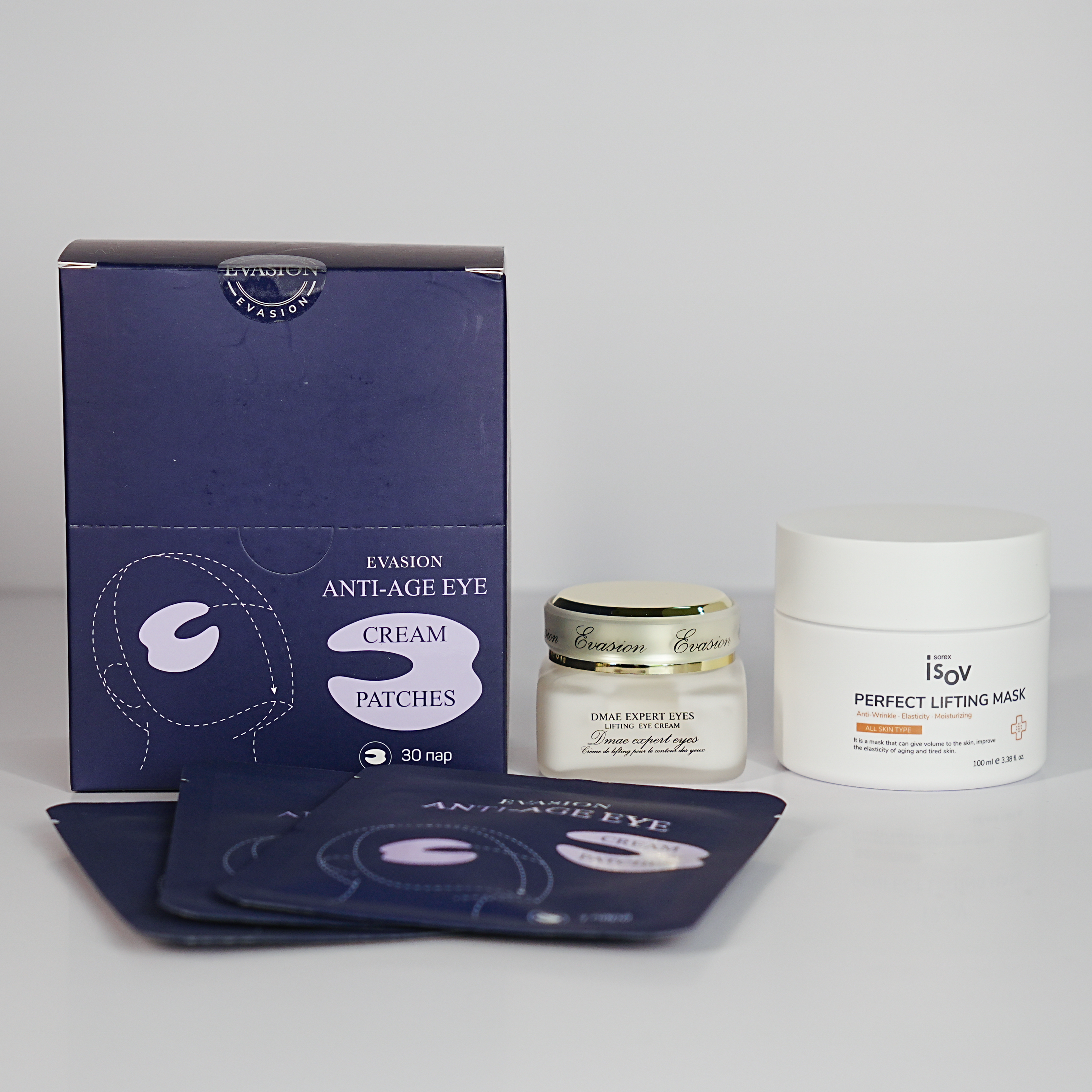 • Патчи для глаз Anti-age eye cream-patches Evasion— устраняют отёки, синеву, разглаживают «гусиные лапки» и глубоко увлажняют кожу.