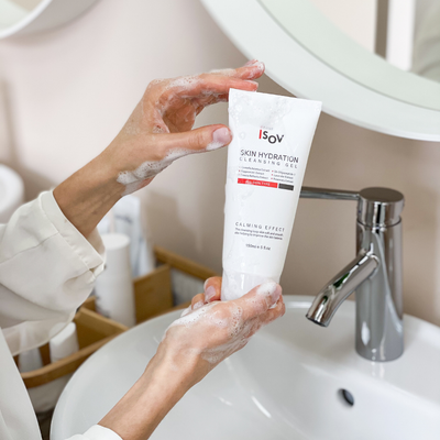 Сначала — деликатное очищение с гелем Skin Hydration Cleansing Gel от Isov, которое удаляет выделения себума кожей за ночь, не разрушая защитный барьер.